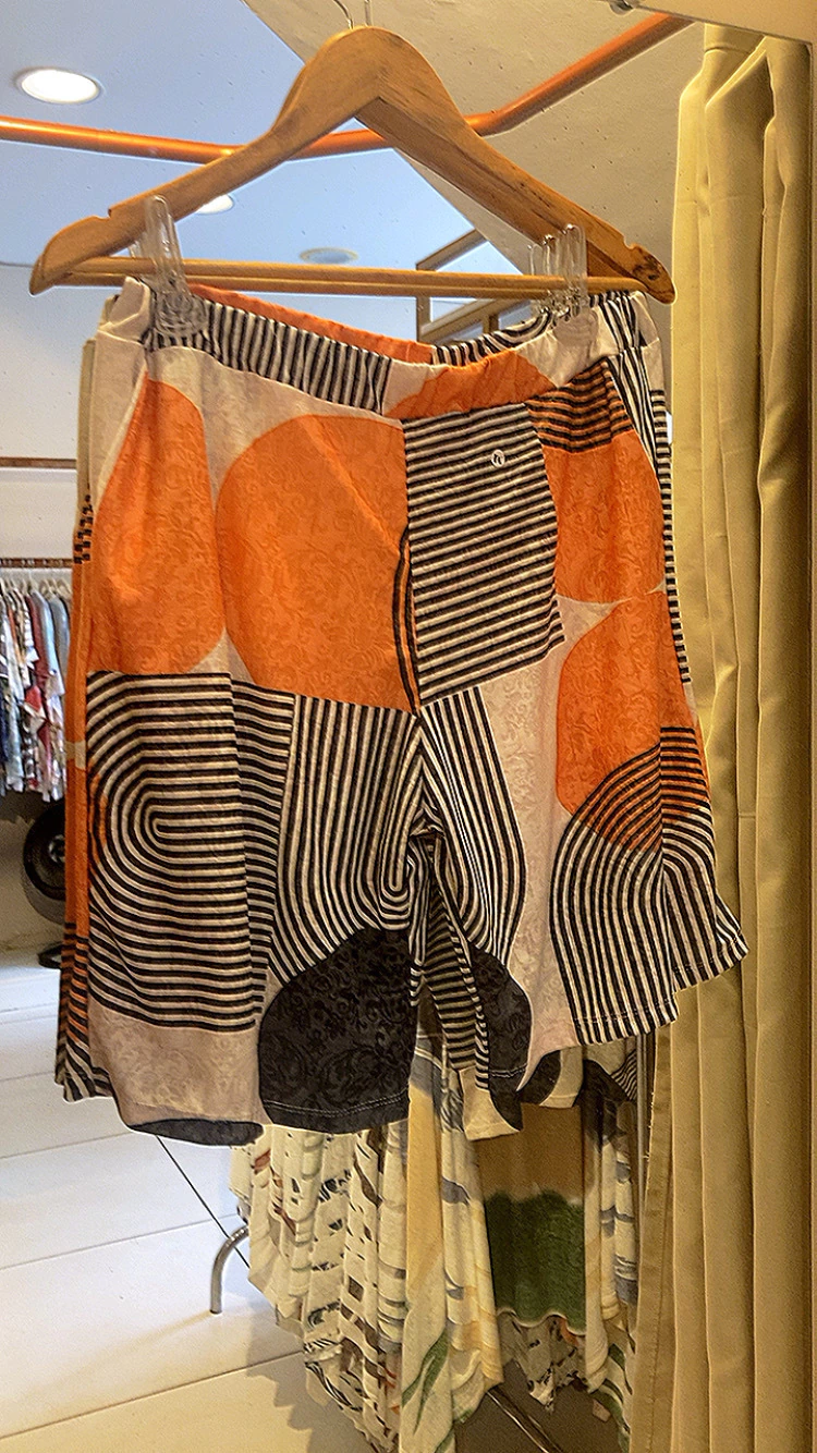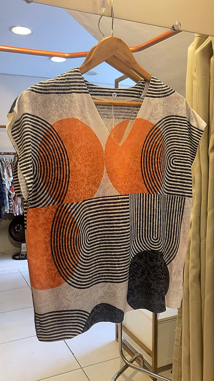 Modelagem ampla que proporciona liberdade de movimento, com estampas exclusivas aplicadas após a costura, conferindo um toque artesanal e único a cada peça.